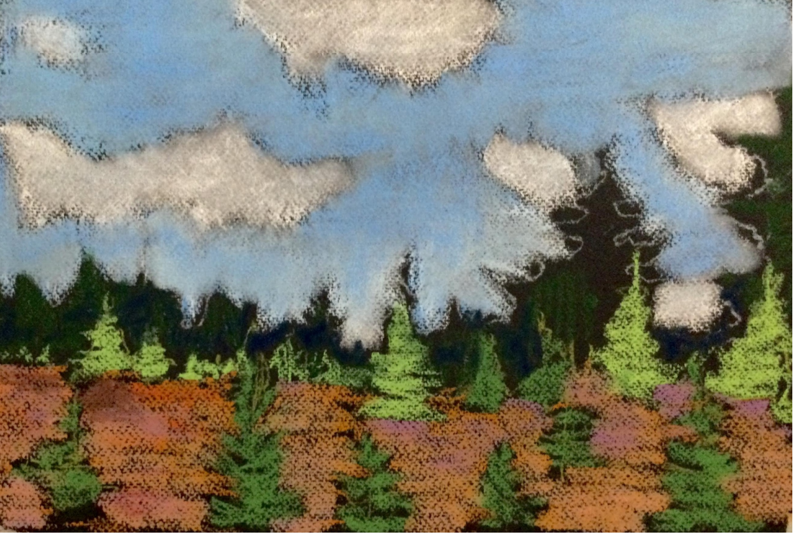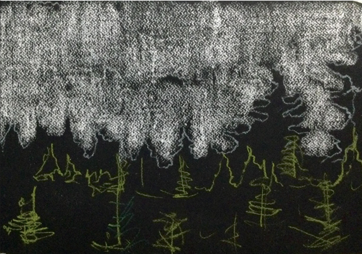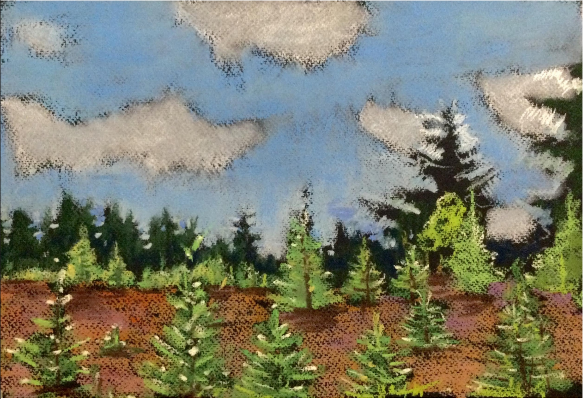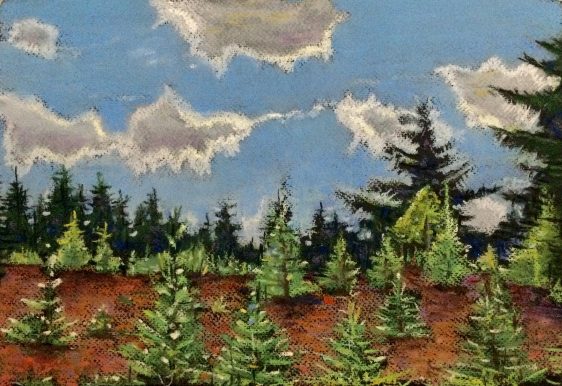 Создаём светло-голубым и белым пигментом необходимый и более точный контур елей на фоне неба